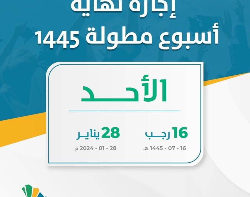 أجازه نهاية أسبوع مطولة 1445 طبقا لوزارة التعليم بالمملكة العربية السعودية يوم الاحد السادس عشر من رجب لعام 1445 هجريا الموافق الثامن والعشرين من يناير 2024 ميلاديا