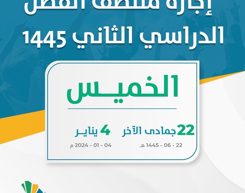 إجازة منتصف الفصل الدراسي الثاني لعام 1445 حسب تعليمات وزارة التعليم في السعودية نهاية دوام يوم الخميس 22 جمادى الآخر 1445 هـ الموافق 4 يناير 2024 م.