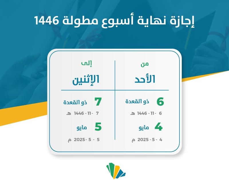 إجازة نهاية أسبوع مطولة 1446 طبقا لوزارة التعليم بالمملكة العربية السعودية يومي الأحد والاثنين 6 -7 ذو القعدة 1446 الموافقين 4 -5 مايو 2025.