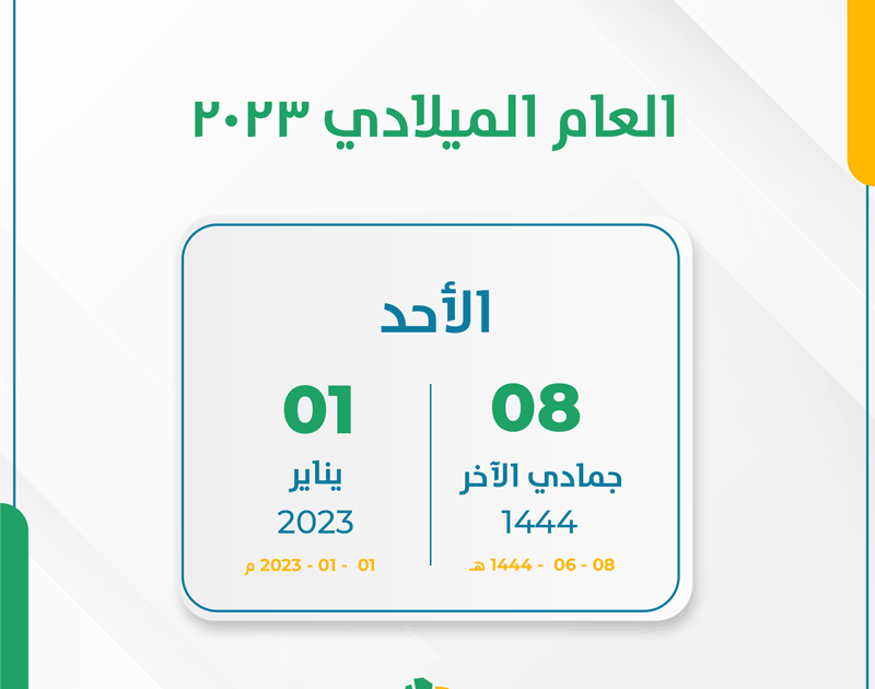 موعد العام الميلادي 2023 م في يوم الأحد 8 جمادى الآخرة 1444 هـ – الموافق 1 يناير 2023 م .