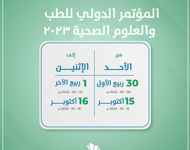 تستضيف مكة المكرمة المؤتمر الدولي للطب والعلوم الصحية 2023 لمدة يومين 15 و16 أكتوبر في فندق موفنبيك برج هاجر. لبحث سبل تطور الطب والعلوم الصحية وفقاً لرؤية المملكة المتطورة.