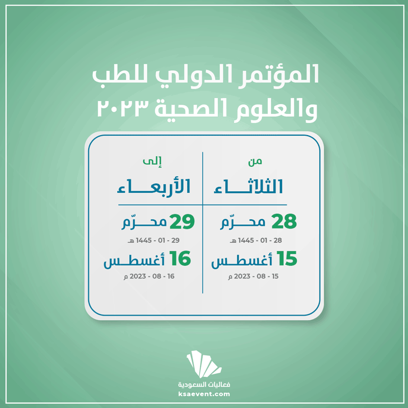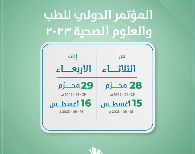 تستعد الأوساط الطبية لانطلاق المؤتمر الدولي للطب والعلوم الصحية 2023 في المدينة المنورة لمدة يومين 15 و16 أغسطس. تقديم الأبحاث الجارية في هذا المجال وتطوراته.