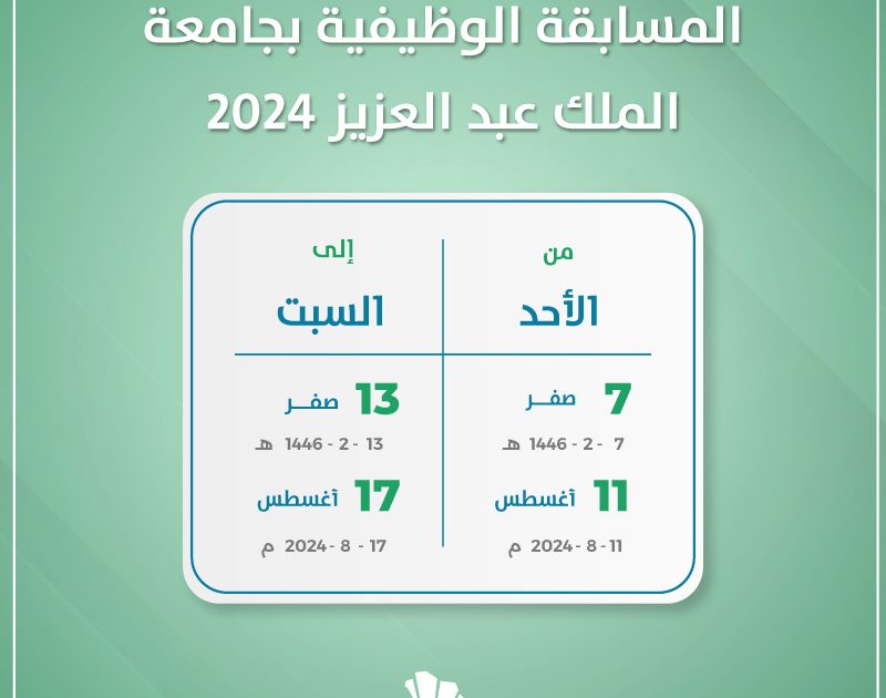 ومن المقر أن يبدأ التقديم في المسابقة الوظيفية بجامعة الملك عبد العزيز 2024 خلال الفترة 11 -17 أغسطس. في نفس السياق يدعم هذا الحدث رسالة الجامعة التي تدور حول بناء كفاءات متخصصة ومميزة تواكب متغيرات سوق العمل. وذلك من خلال برامج تعليمية تنافسية، وكوادر مؤهلة، كل هذا في بيئة أكاديمية وبحثية جاذبة.