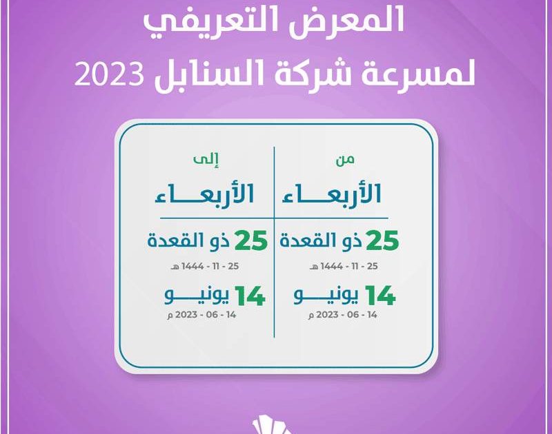 يقام بالعاصمة الرياض بالمملكة العربية السعودية بفندق الفورسيزونز المعرض التعريفي لمسرعة شركة السنابل 2023. وذلك يوم الرابع عشر من يونيو يوافق هذا التاريخ الميلادي الخامس والعشرين من ذو القعدة لعام 1444 هجريا.