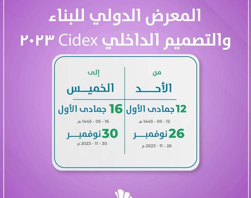 تعقد شركة معارض ظهران الدولية المعرض الدولي للبناء والتصميم الداخلي Cidex 2023. والذي سيقام في مركز معارض ظهران الدولي بالمملكة العربية السعودية. خلال الفترة ما بين الاحد 12 الي الخميس 16 جماد الاول 1445. الموافق 26 نوفمبر الي 30 نوفمبر 2023م. ويركز المعرض على صناعة البناء والتشييد والتصميم الداخلي والاثاث.