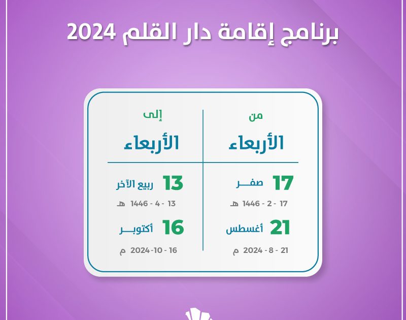 ومن المقرر إقامة برنامج إقامة دار القلم 2024 خلال الفترة 21 أغسطس حتى 16 أكتوبر بالمدينة المنورة. ويوفر البرنامج فرصة للفنانين المقيمين من أجل لقاء الممارسين، والمبدعين الآخرين. بالإضافة إلى التفرغ لقضاء هذا الوقت المخصص للبحث والإنتاج في الاستوديوهات الخاصة.