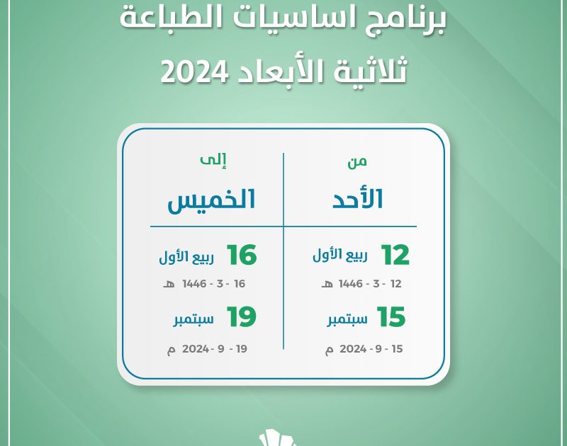 تستعد أكاديمية طويق لاستقبال برنامج اساسيات الطباعة ثلاثية الابعاد 2024 في الفترة من الخامس عشر وحتي التاسع عشر من سبتمبر 2024 الموافق الثاني عشر وحتي السادس عشر من ربيع الأول 1446.