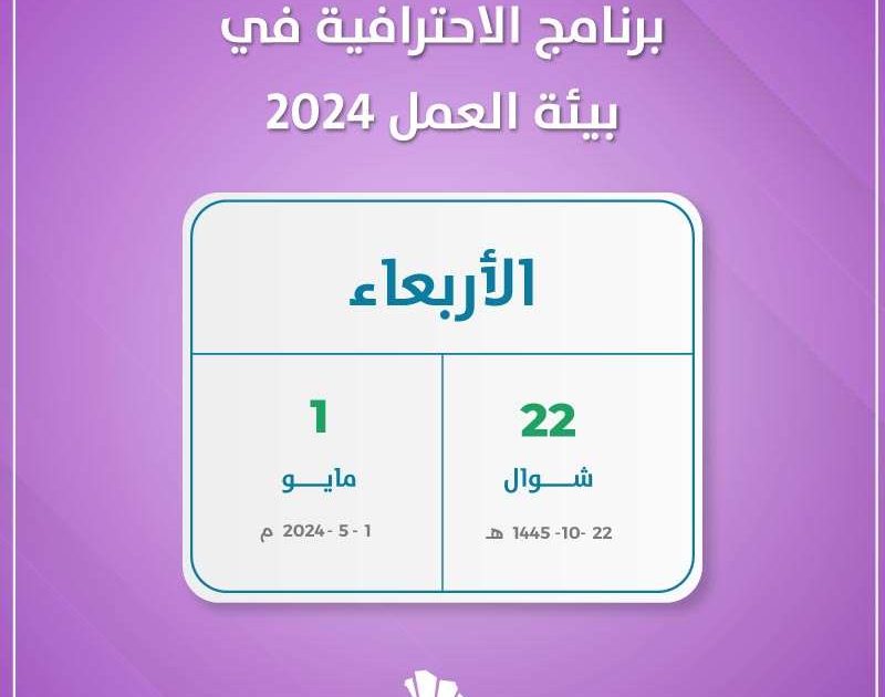 سيقام بغرفة الشرقية برنامج الاحترافية في بيئة العمل 2024. وذلك يوم الأول من شهر مايو لعام 2024 ميلاديا. بينما يوافق هذا التاريخ الثاني والعشرين من شهر شوال لعام 1445 هجريا.