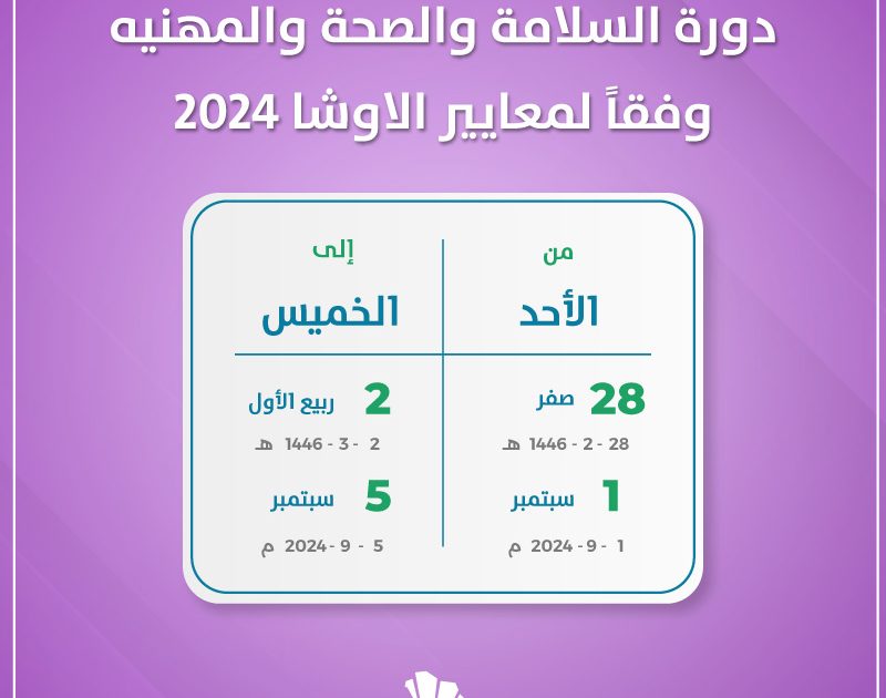 تعد دورة دورة السلامة والصحة والمهنيه وفقاً لمعايير الاوشا برنامجا تدريبيا مصمما لتزويد المشاركين بمعرفة عميقة بمعايير السلامة والصحة المهنيه في مكان العمل. وتعتبر هذه الدورة ضرورية لضمان بيئة عمل آمنة وسليمة لجميع العاملين. أيضا هي تساعد على تحديد وتقييم المخاطر المحتملة في مكان العمل واتخاذ الإجراءات اللازمة للحد منها. كذلك تتضمن الدورة الالتزام بمعايير OSHA القانونية. مما يقلل من خطر الحوادث والإصابات.