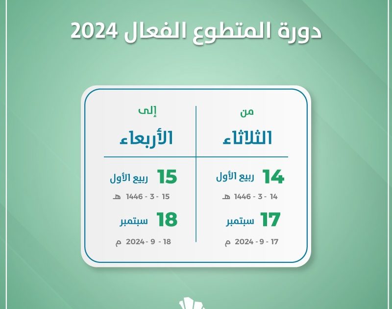 تستعد غرفة مكة المكرمة لإستقبال دورة المتطوع الفعال 2024 وذلك يومي الرابع عشر والخامس عشر من ربيع الأول 1446 الموافق السابع عشر والثامن عشر من سبتمبر 2024 .