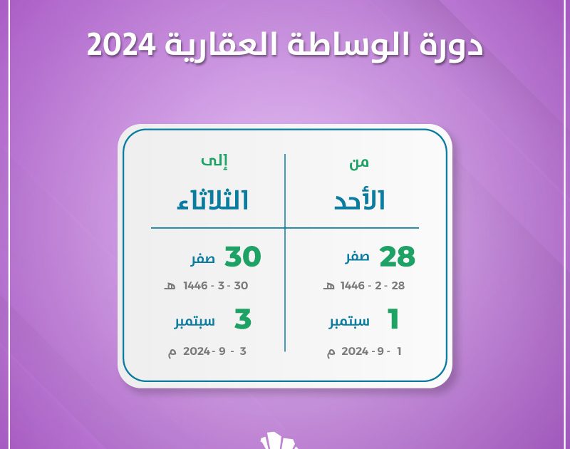 يستعد المعرض العقاري السعودي لأستقبال دورة الوساطة العقارية 2024 وذلك يوم الأحد واحد سبتمبر 2024 الموافق الثامن والعشرون من صفر 1446 هجري. حتي الثلاثاء الثالث من سبتمبر 2024 الموافق الثلاثون من صفر 1446 هجري .