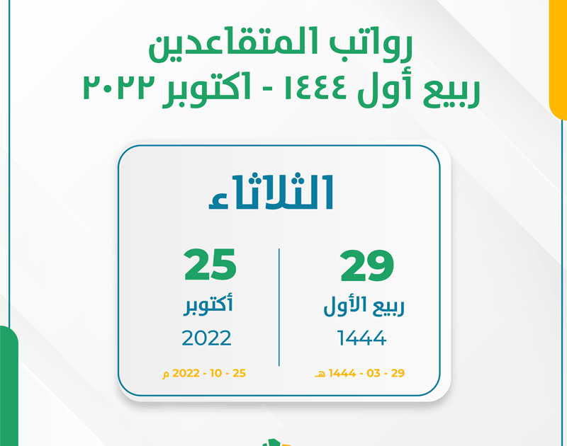 موعد راتب المتقاعدين لشهر ربيع أول 1444 هـ في يوم الثلاثاء 29 ربيع أول 1444 هـ – الموافق 25 أكتوبر 2022 م .