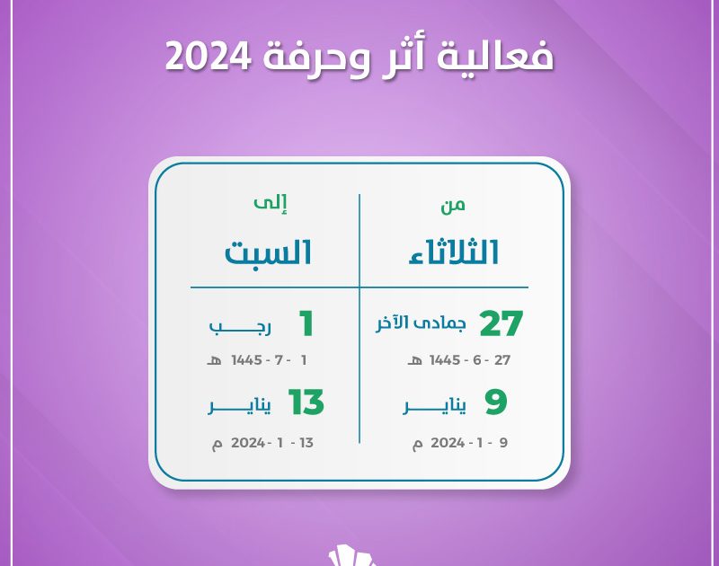 كما تضم فعالية أثر وحرفة 2024 على مدى خمسة أيام مجموعة من المخرجات والمعالم الرئيسية التي تثري تجربة الزائر، مثل: