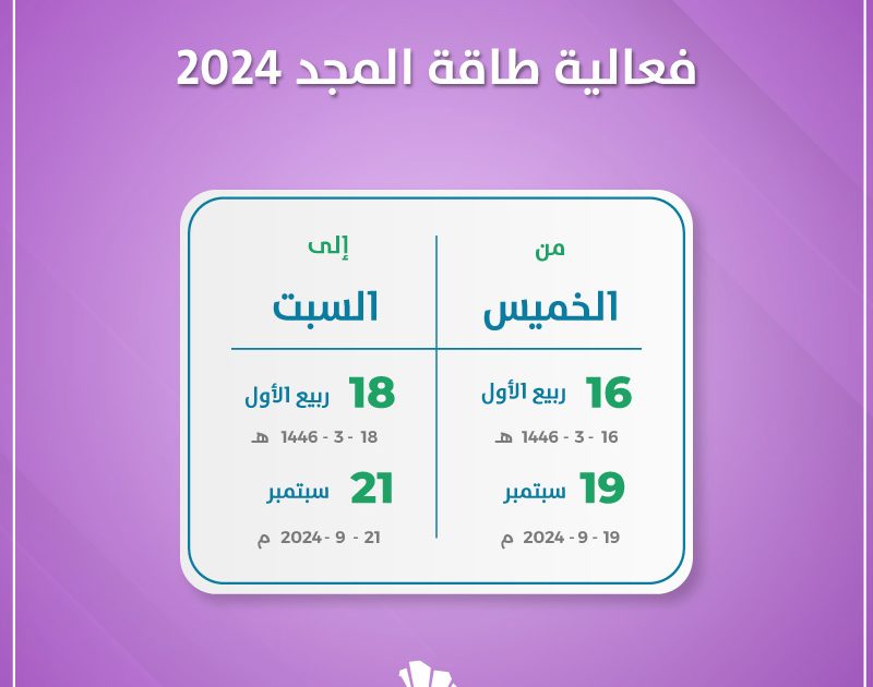 في إطار علمي وطني تنطلق فعالية طاقة المجد 2024 خلال الفترة 19 -21 سبتمبر. حيث تقدم مجموعة من الأنشطة والتجارب العلمية الجديدة والحصرية.