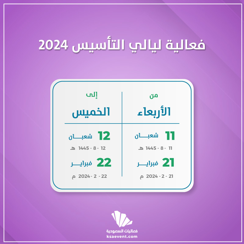 في الفترة من 21 فبراير إلى 22 فبراير، سيشهد مسرح أبو بكر سالم في المملكة العربية السعودية أمسية شعرية وغنائية استثنائية. بمناسبة يوم التأسيس حيث تأتي فعالية ليالي التأسيس 2024. تتميز هذه الفعالية بتجمعها بين الشعر والغناء. لتأخذ الحاضرين في رحلة عبر الزمن.