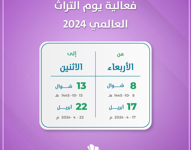 تستضيف مدينة الرياض فعالية يوم التراث العالمي 2024، في الع عشر من شهر أبريل حتى الثاني والعشرون من نفس الشهر. يوافق هذا التاريخ الثامن من شوال حتى الثالث عشر من نفس الشهر لعام 1445 هجرياً.