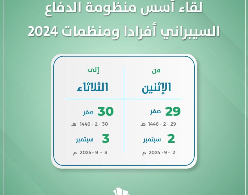 تستعد مبادرة العطاء الرقمي لاستقبال لقاء أسس منظومة الدفاع السيبراني أفرادا ومنظمات 2024 ذلك يوم الإثنين الثاني من سبتمبر 2024 الموافق التاسع والعشرون من صفر 1446 هجري حتى الثلاثاء الثالث من سبتمبر 2024 الموافق الثلاثون من صفر 1446 هجري.