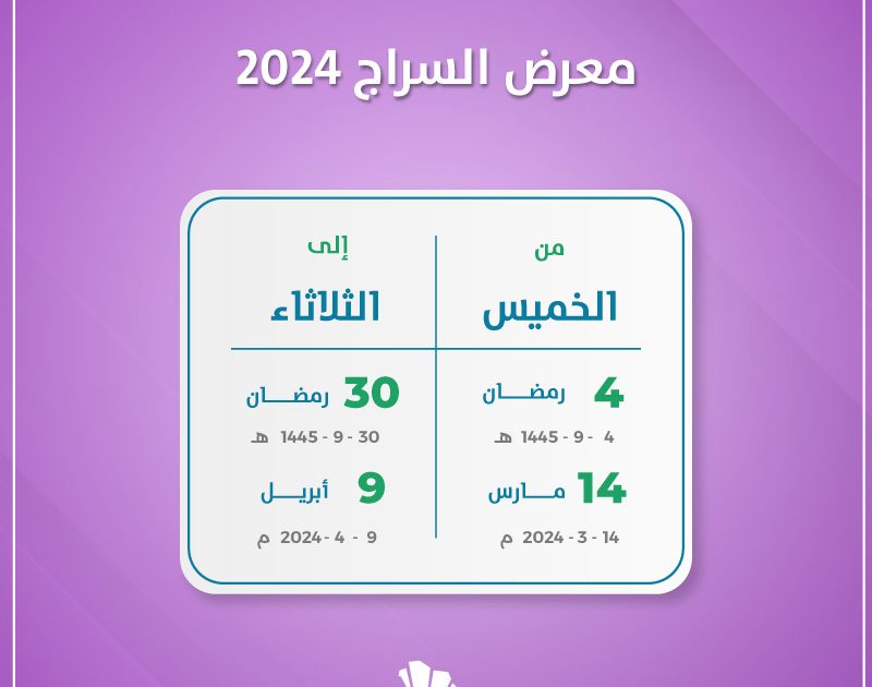 من المقرر أن ينظم معرض السراج في فترة محدودة تمتد من 14 مارس إلى 9 أبريل، حيث ستكون الفعاليات مفتوحة يوميًا من الساعة 7 مساءً وحتى الساعة 1 صباحًا.