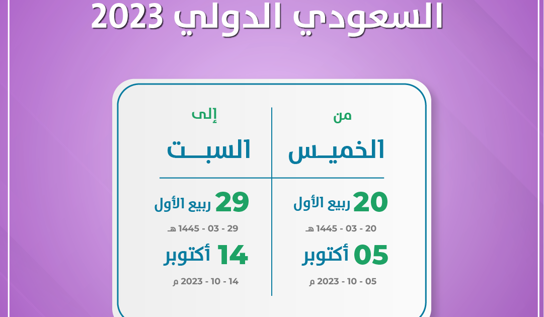 كما تم تأكيد موعد الحدث بعد اعلان نادي الصقور السعودي عن إقامة معرض الصيد والصقور السعودي الدولي 2023، خلال الفترة من 5 – 14 أكتوبر 2023م. وذلك في مقر نادي الصقور السعودي بملهم شمال مدينة الرياض.