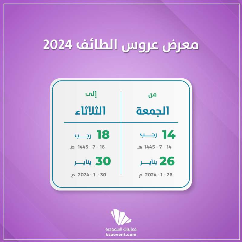 تحتضن مدينة الطائف بقاعة السلام بالمملكة العربية السعودية معرض عروس الطائف 2024. وذلك من الرابع عشر وحتى الثامن عشر من شهر رجب لعام 1445 هجريا. بينما يوافق هذا التاريخ السادس والعشرون وحتى الثلاثين من شهر يناير لعام 2024 ميلاديا.