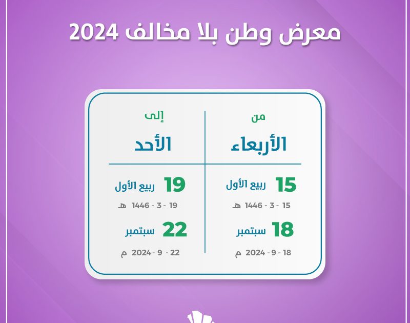 ينطلق معرض المديرية العامة لحرس الحدود “وطن بلا مخالف” يوم 18 سبتمبر تحديدا في مجمع كادي مول في منطقة جازان. ويستمر حتى الأحد 22 سبتمبر.