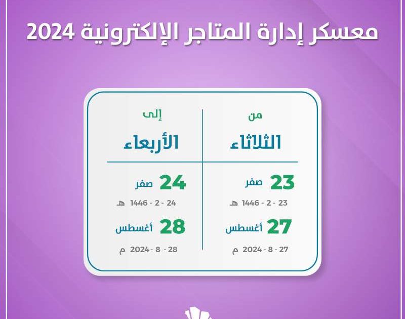سيقام بغرفة مكة المكرمة معسكر إدارة المتاجر الإلكترونية 2024. وذلك علي مدار يومي الثلاثاء والأربعاء الموافق السابع والعشرين والثامن والعشرين من شهر أغسطس لعام 2024 ميلاديا. بينما يوافق هذا التاريخ الثالث والعشرين والرابع والعشرين من شهر صفر لعام 1446 هجريا.