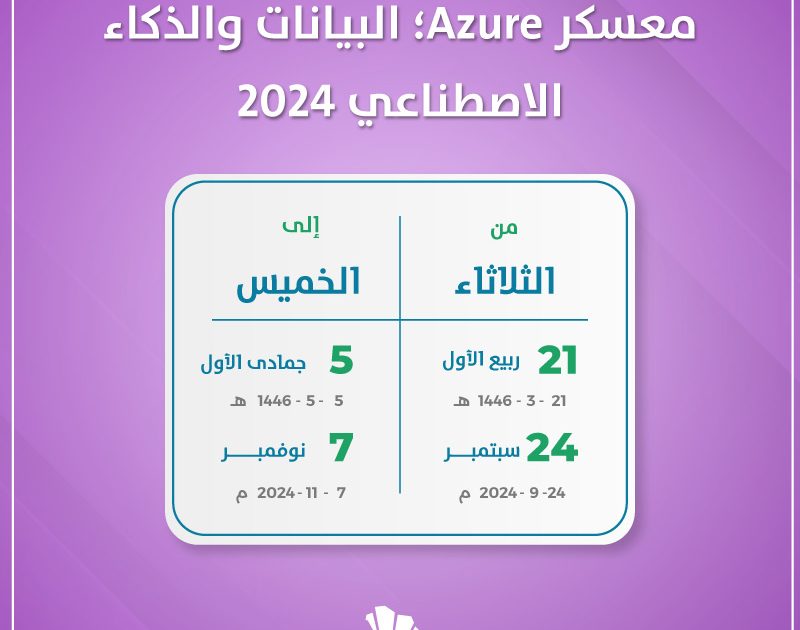 تستعد أكاديمية طويق لإستقبال معسكر Azure؛ البيانات والذكاء الاصطناعي 2024 ذلك يوم الثلاثاء الرابع والعشرون من سبتمبر 2024 الموافق الواحد والعشرون من ربيع الأول 1446 هجري. حتى الخميس السابع من نوفمبر 2024 الموافق الخامس من جمادى الأول