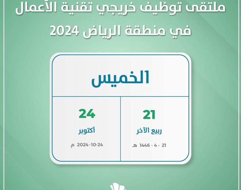 في إطار تنمية الكوادر البشرية وتأهيلهم لسوق العمل ينعقد ملتقى توظيف خريجي تقنية الأعمال في منطقة الرياض 2024 يوم 24 أكتوبر.
