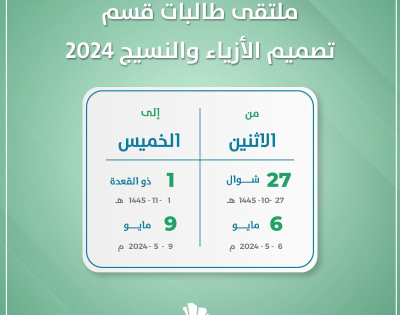 تستضيف كلية التصاميم والفنون بجامعة الأميرة نورة فعاليات ملتقى طالبات قسم تصميم الأزياء والنسيج 2024. وذلك خلال الفترة 6 -9 مايو بحضور أعضاء هيئة التدريس وطالبات وخريجات القسم.