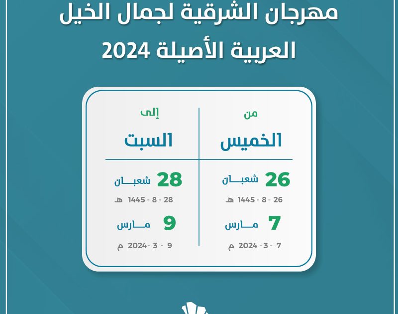 يذكر أنه تم تحديد موعد مهرجان الشرقية لجمال الخيل وفقاً لما أعلنته مركز الملك عبدالعزيز للخيل العربية عن تفاصيل برنامج عروض الخيل العربية للعام 2024 في المملكة.