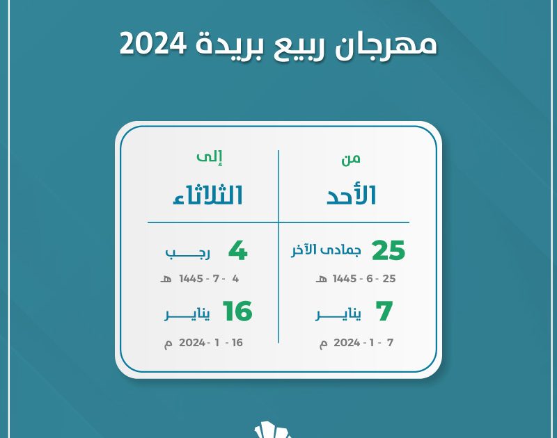 وتنعقد فعاليات مهرجان ربيع بريدة 45 تحت شعار “ربيعنا هالمرة غير” بتنظيم إمارة منطقة القصيم، وبالتعاون مع المركز الوطني للغطاء النباتي ومكافحة التصحر. ومن المقرر أن تمتد الفعاليات 10 أيام بمنتزه القصيم الوطني في بريدة.