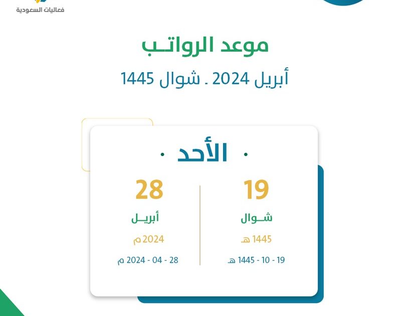 راتب الموظفين الحكوميين السعوديين لشهر شوال 1445 هـ في يوم الأحد 28 أبريل 2024 ميلاديا.