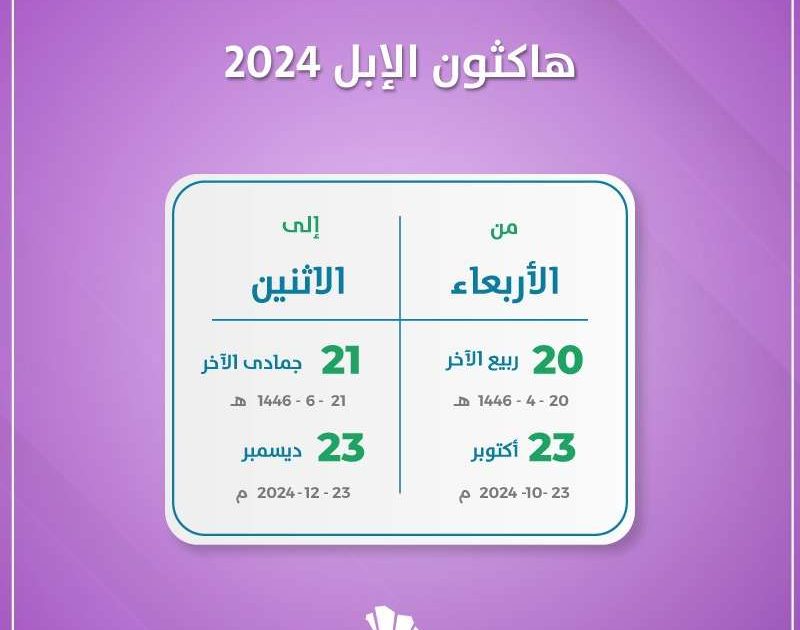 سيقام بمدينة الحائل هاكثون الإبل 2024. وذلك لمدة شهرين من الثالث والعشرين من شهر اكتوبر وحتى الثالث والعشرين من شهر ديسمبر لعام 2024 ميلاديا. بينما يوافق هذا التاريخ العشرين من شهر ربيع الآخر وحتى الحادي والعشرين من جمادى الآخر لعام 1446 هجريا.
