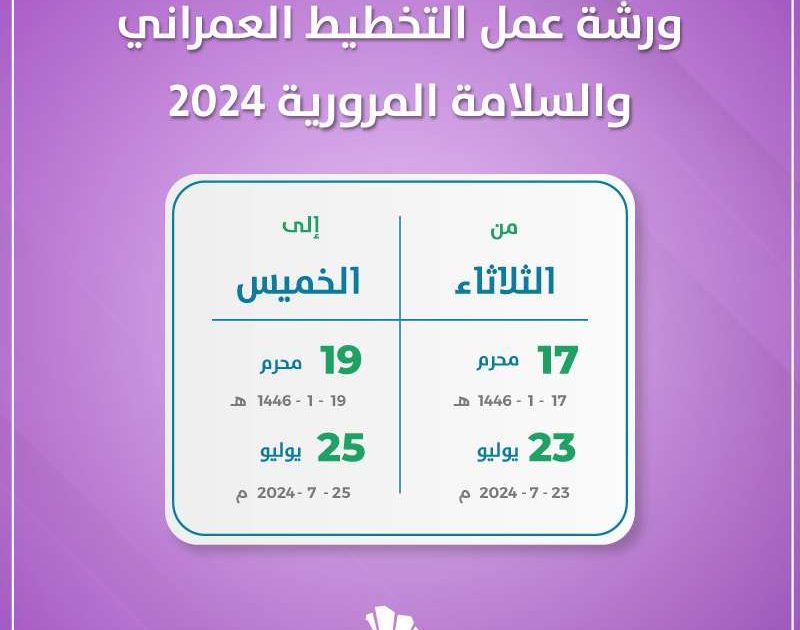 ستقام بمدينة الرياض ورشة عمل التخطيط العمراني والسلامة المرورية 2024. وذلك من الثالث والعشرين وحتى الخامس والعشرين من شهر يوليو لعام 2024 ميلاديا. بينما يوافق هذا التاريخ السابع عشر وحتى التاسع عشر من شهر محرم لعام 1446 هجريا.