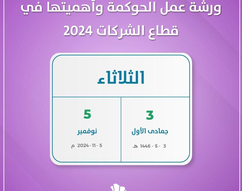 سيقام بمقر غرفة الجوف ورشة عمل الحوكمة وأهميتها في قطاع الشركات 2024. وذلك يوم الثلاثاء الموافق الخامس من شهر نوفمبر لعام 2024 ميلاديا. بينما يوافق هذا التاريخ الثالث من شهر جمادى الأول لعام 1446 هجريا.