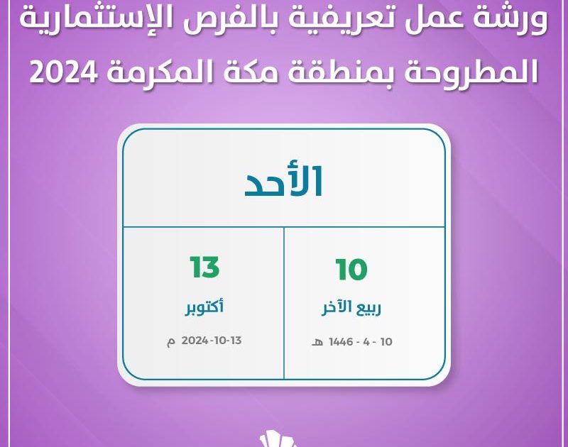 تستضيف قاعة الجفالي ورشة عمل تعريفية بالفرص الاستثمارية المطروحة بمنطقة مكة المكرمة 2024. يوم الأحد الثالث عشر من أكتوبر الموافق العاشر من ربيع الآخر لعام 1446.