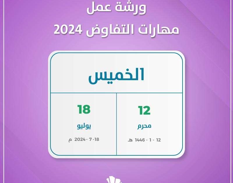 ستنظم الهيئة السعودية للمحامين ورشة عمل مهارات التفاوض 2024 بغرفة الشرقية . وذلك يوم الخميس الموافق الثامن عشر من شهر يوليو لعام 2024 ميلاديا. بينما يوافق هذا التاريخ الثاني عشر من شهر محرم لعام 1446 هجريا.