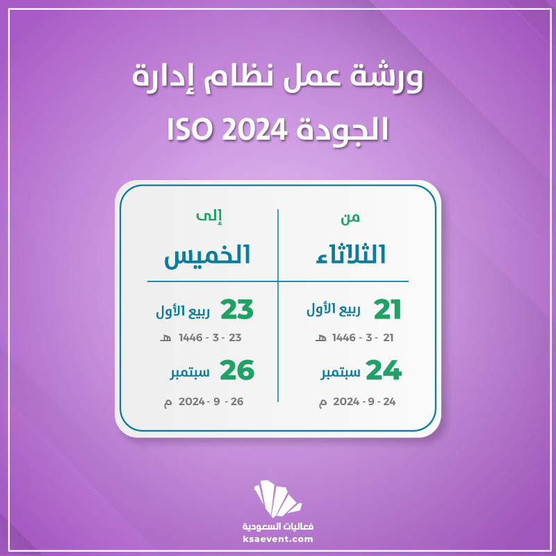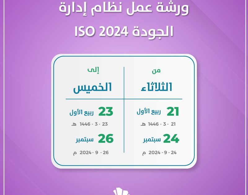 تعد ورشة عمل نظام إدارة الجودة ISO 2024 فرصة هامة للمؤسسات لتحسين جودة منتجاتها وخدماتها وفقًا للمعايير العالمية. ستركز الورشة على تزويد المشاركين بفهم شامل لمتطلبات نظام إدارة الجودة ISO 9001. وكيفية تطبيقه داخل المنشآت لتحقيق التميز في الأداء وضمان رضا العملاء.