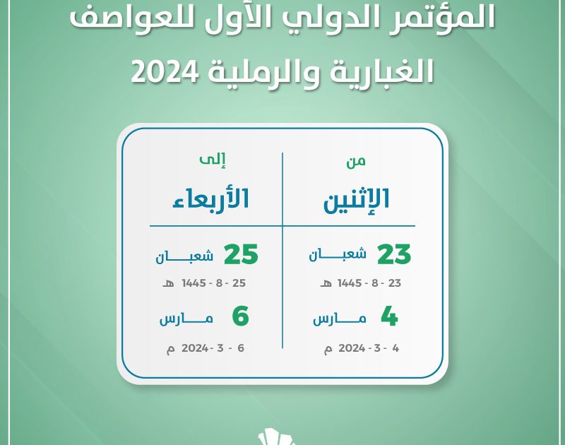 تستضيف المملكة ممثلة بالمركز الوطني للأرصاد المؤتمر الدولي الأول للعواصف الغبارية والرملية 2024. بحضور دولي رفيع المستوى وتنظيم المركز الإقليمي للتحذير من العواصف الغبارية والرملية المعتمد مؤخرًا من المنظمة العالمية للأرصاد الجوية بصفته مركزاً إقليمياً لخدمة دول المنطقة، وذلك من الرابع إلى السادس من مارس المقبل بالعاصمة الرياض.