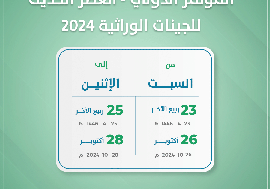 دعماً للقطاع الطبي بالمملكة ينعقد المؤتمر الدولي – العصر الحديث للجينات الوراثية 2024 وذلك بحضور الخبراء والمتخصصين.
