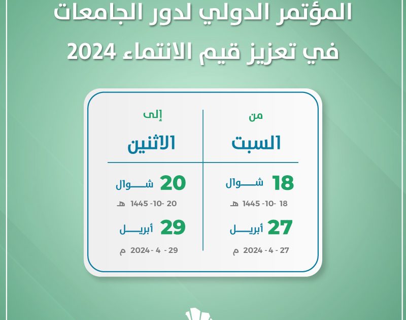 ومن المقرر إقامة المؤتمر الدولي لدور الجامعات في تعزيز قيم الانتماء 2024 خلال الفترة 27-29 أبريل في مبنى المؤتمرات في المدينة الجامعية بالرياض.