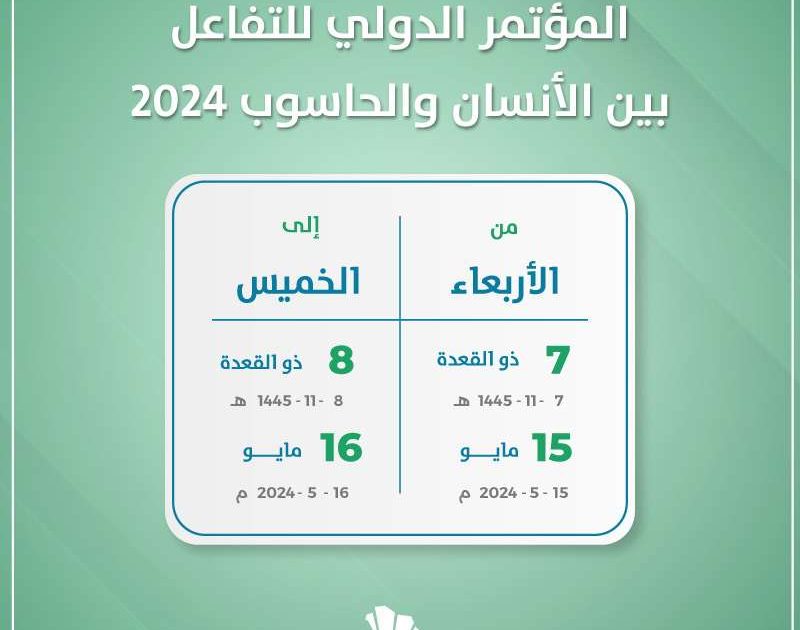 يقام بمدينة جدة بالمملكة العربية السعودية المؤتمر الدولي للتفاعل بين الإنسان والحاسوب 2024. وذلك يومي الخامس عشر والسادس عشر من شهر مايو لعام 2024 ميلاديا. بينما يوافق هذا التاريخ السابع والثامن من شهر ذو القعدة لعام 1445 هجريا.