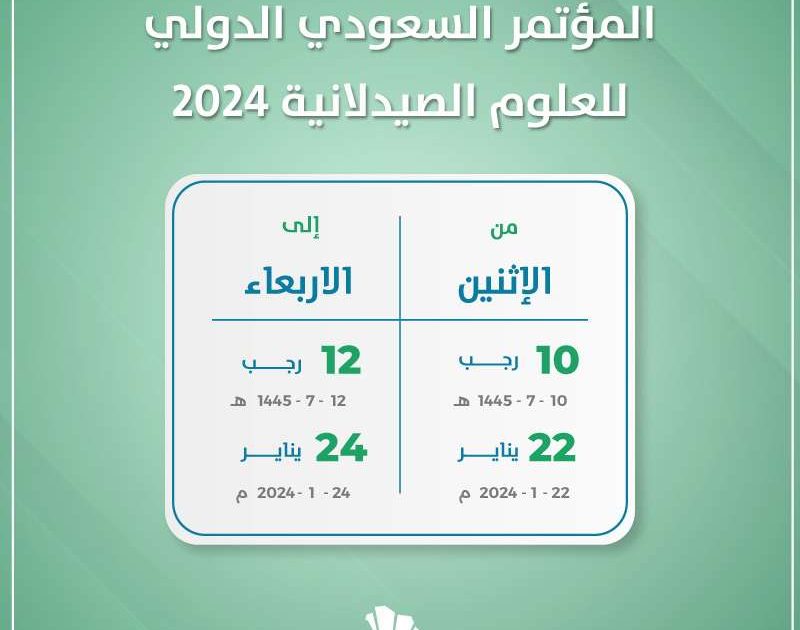ينعقد ببرج الفيصلية بالمملكة العربية السعودية المؤتمر السعودي الدولي للعلوم الصيدلانية 2024. وذلك من الإثنين الموافق الثاني والعشرين من يناير وحتى الرابع والعشرين من الشهر نفسه لعام 2024 ميلاديا. بينما يوافق هذا التاريخ العاشر وحتى الثاني عشر من رجب لعام 1445 هجريا.