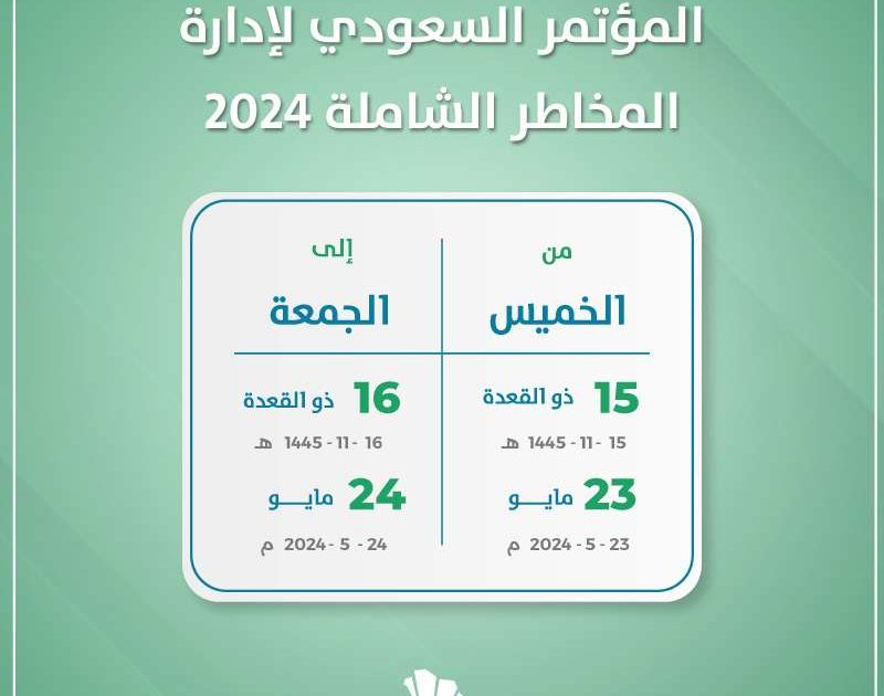 ينعقد بفندق دبل تري هيلتون بمدينة الرياض بالمملكة العربية السعودية المؤتمر السعودي لإدارة المخاطر الشاملة 2024. وذلك يومي الخميس والجمعة الثالث والعشرين والرابع والعشرين من مايو لعام 2024 ميلاديا. بينما يوافق هذا التاريخ الخامس عشر والسادس عشر من ذو القعدة لعام 1445 هجريا.