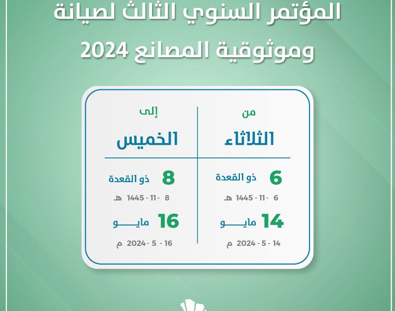 يستعد المؤتمر السنوي الثالث لصيانة وموثوقية المصانع 2024 بفارغ الصبر لاستقبال المشاركين في الفترة من 14 إلى 16 مايو 2024، في فندق كمبينسكي العثماني بمدينة الخبر، المملكة العربية السعودية.