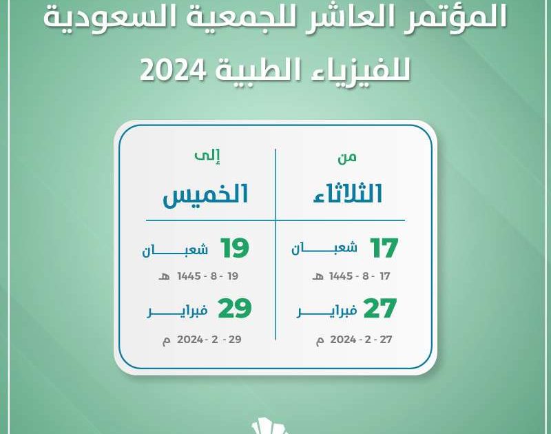 ينعقد بفندق انتركونتيننتال بمدينة جدة بالمملكة العربية السعودية المؤتمر العاشر للجمعية السعودية للفيزياء الطبية 2024. وذلك من السابع والعشرين من شهر فبراير وحتى التاسع والعشرين من الشهر نفسه لعام 2024 ميلاديا. بينما يوافق هذا التاريخ السابع عشر وحتى التاسع عشر من شهر شعبان لعام 1445 هجريا.