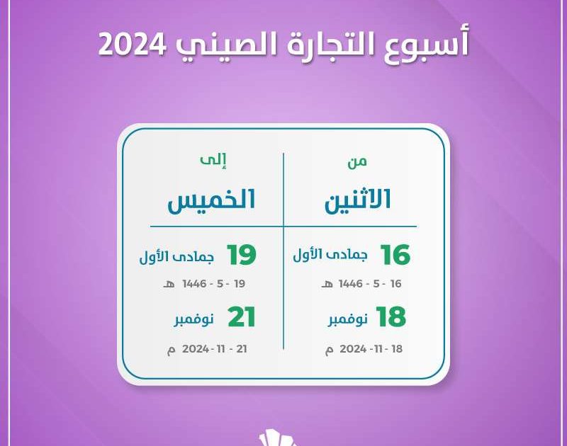 ينعقد بمركز الرياض الدولي للمعارض والمؤتمرات أسبوع التجارة الصيني 2024. وذلك علي من الثامن عشر والحادي عشرين من شهر نوفمبر لعام 2024 ميلاديا. بينما يوافق هذا التاريخ السادس عشر والتاسع عشر من جمادى الأول لعام 1446 هجريا.