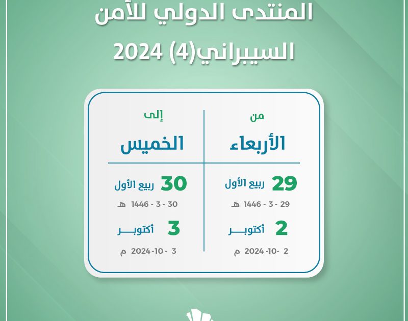 تنظم الهيئة الوطنية للأمن السيبراني النسخة الرابعة من المنتدى الدولي للأمن السيبراني 4 2024 في مدينة الرياض. وذلك تحت شعار : “تعظيم العمل المشترك في الفضاء السيبراني”.
