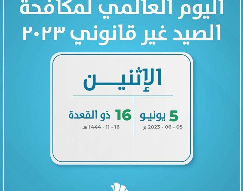 يحتفل العالم كل عام في الخامس من يونيو الموافق السادس عشر من ذو القعدة لهذا العام باليوم العالمي لمكافحة الصيد غير قانوني 2023. بمناسبة الاحتفال السادس باليوم العالمي لمكافحة الصيد غير القانوني دون إبلاغ ودون تنظيم (الصيد غير القانوني). أيضا دعماً للسنة الدولية لمصائد الأسماك الصغيرة النطاق والحرفية وتربية الأحياء المائية. تنظم الفاو محادثة عن بعد حول تأثير الصيد غير القانوني على صغار الصيادين ومجتمعاتهم، وإمكانية تحويل صغار الصيادين لحماة المحيط ضد الصيد الغير قانوني.