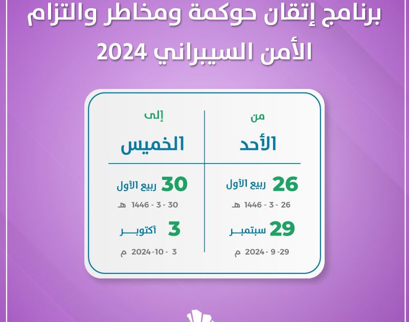 يعد برنامج إتقان حوكمة ومخاطر والتزام الأمن السيبراني 2024، الذي تنظمه أكاديمية طويق في الرياض، فرصة هامة لتطوير المهارات السيبرانية اللازمة لإدارة الحوكمة والمخاطر السيبرانية بفعالية. يمتد البرنامج لمدة أسبوع، من 29 سبتمبر حتى 3 أكتوبر 2024، ويهدف إلى تدريب المشاركين على أفضل الممارسات العالمية في مجال الأمن السيبراني.